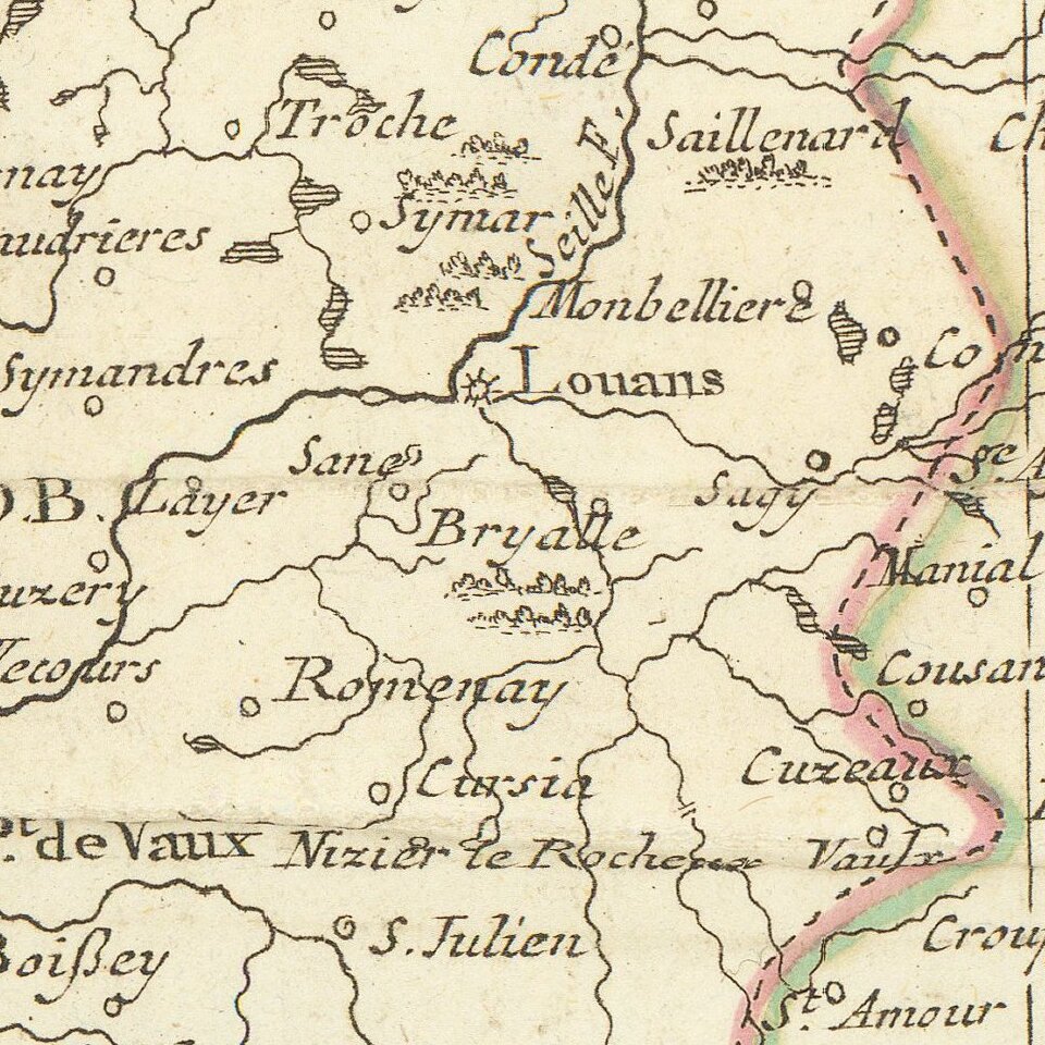 Decorative map of the Burgundy, Franche Comte and Lyon regions.
