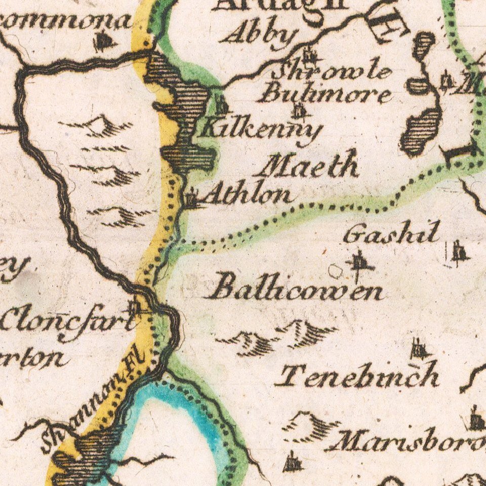 Beautiful small map of Ireland showing mountain ranges, cities, towns and sea ports.