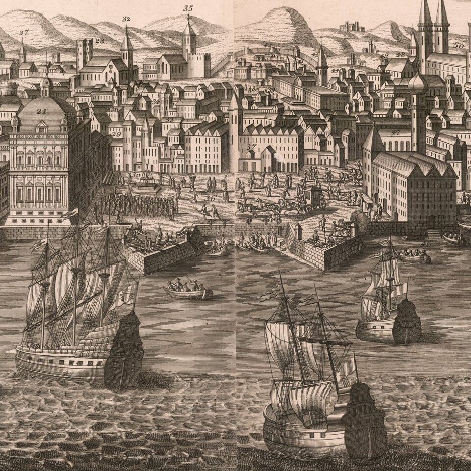 The view demonstrates Probst's characteristic attractive engraving, with its busy harbor scene in the foreground giving way to a complex urban matrix further back.