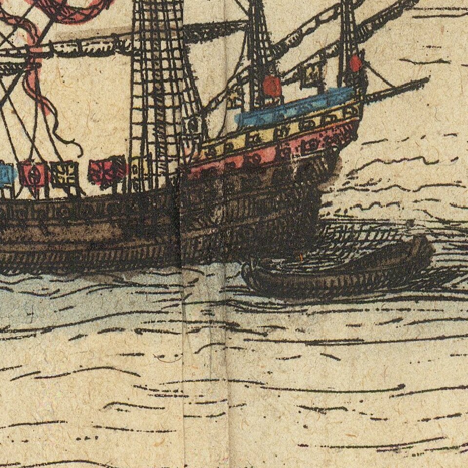 A view of Lisbon and Cascale, which first appeared in Braun and Hogenburg's Civitates Orbis Terrarum. Lisbon is shown as a great port city, with many large ships in its harbor. In the city, castles, churches, port buildings, and citizens can all be seen. Few, if any, of the buildings shown in this map survive to the present day due to a 1755 earthquake leveling much of the city.