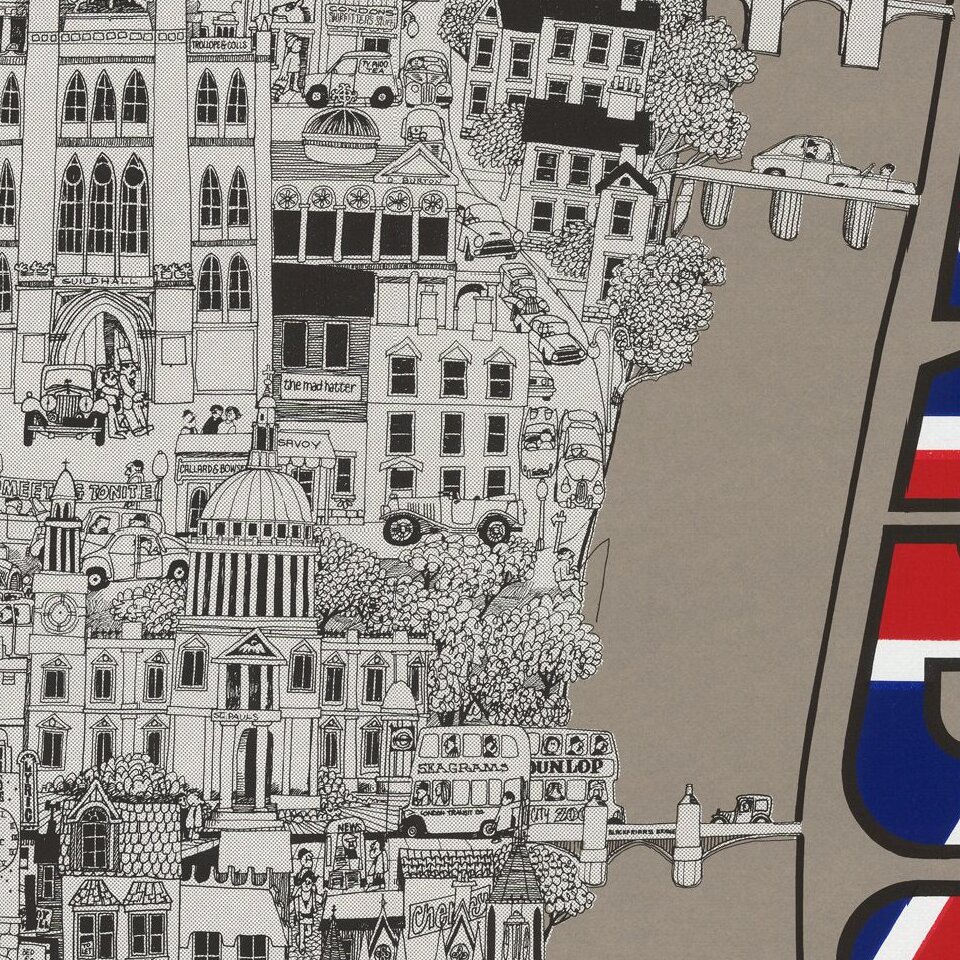 Lively illustrated View of London by California artist David Schiller.