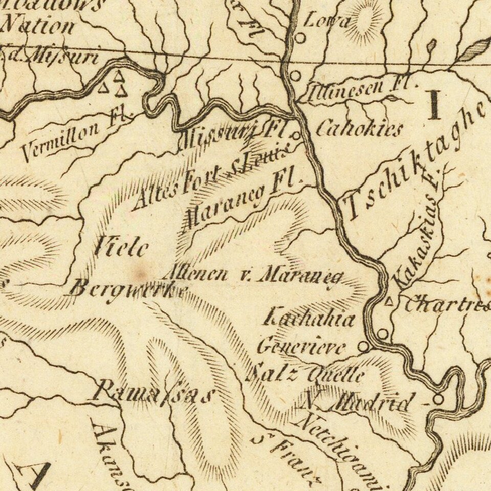 The map includes an excellent treatment of Texas and the Mississippi and Missouri River Valleys and includes the route from the Mississippi River to Texas through S. Antonio and S. Juan de Baptista. Many Indian villages located in Texas, Arkansas and Missouri, along with early western forts.