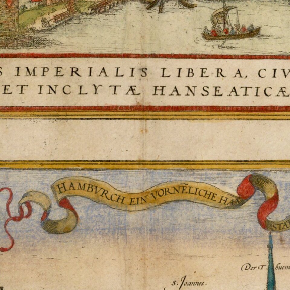 Nice old color example of this pair of birdseye views of Hamburg and Lubeck from an early edition of Braun & Hogenberg's Civitates Orbis Terrarum, the most prolific compilation of city views published in the 16th Century.