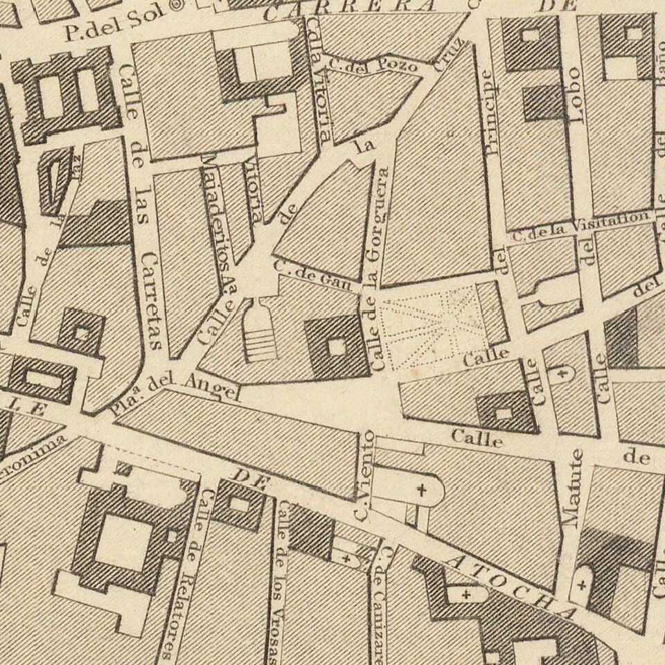 The largest and most central building depicted is El Escorial, the residence of the King of Spain, despite it not being located in Madrid but in nearby San Lorenzo. Other buildings portrayed are the Royal Palace, the Convent of the Salesas Reales, and the Church of San Norberto, the last of which is no longer standing.