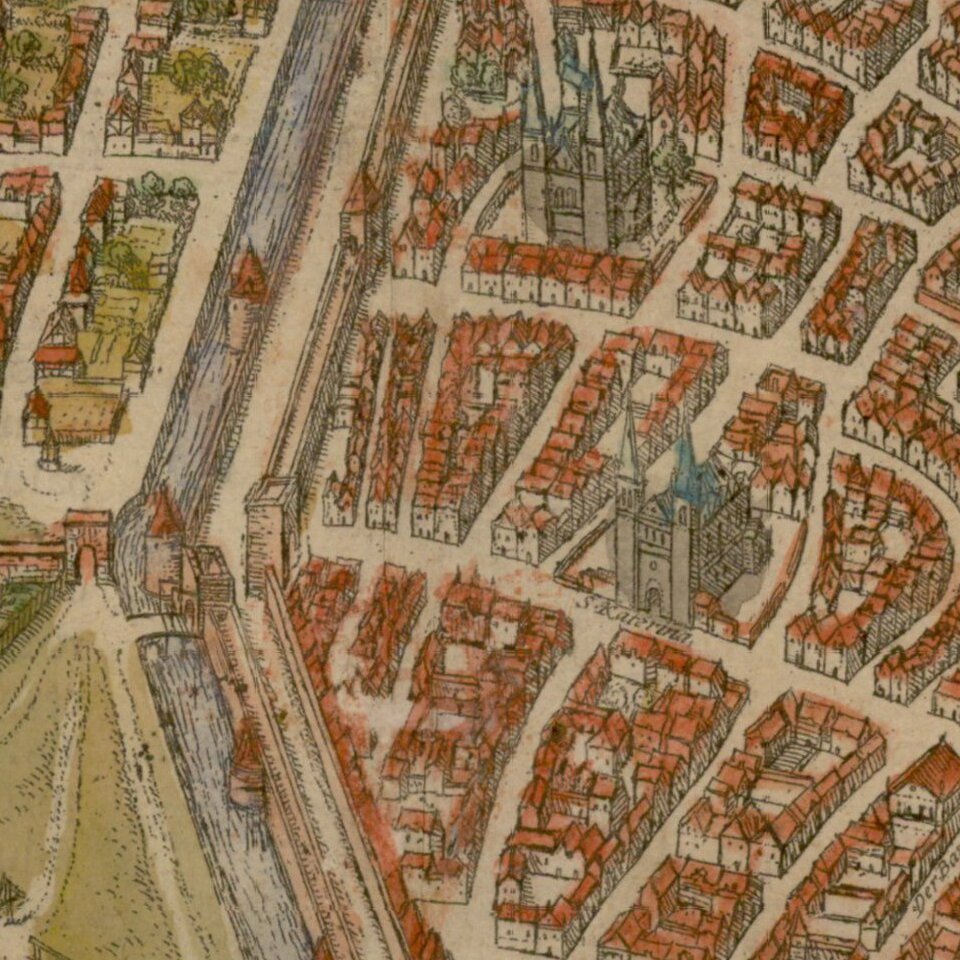 COMMENTARY BY BRAUN: "Magdeburg [...] is the noblest city in Saxony [...]. Here there are splendid houses, magificent streets, large and richly decorated churches: the church of St Maurice built by Emperor Otto is particularly handsome. In Magdeburg there used to be a fortified castle surrounded by fishermen's huts like a village or some other open bourg. There used to be burgraves here as in Nuremberg: whether they were Saxons or Vandals, however, is uncertain. It is known, that after Otto a burgraviate was created by Imperial mandate, and numbered amongst the four burgraves in the empire."
