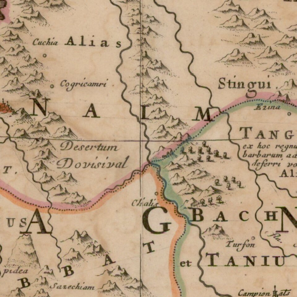 De Wit (1629 ca.-1706) was a mapmaker and mapseller who was born in Gouda but who worked and died in Amsterdam. He moved to the city in 1648, where he opened a printing operation under the name of The Three Crabs; later, he changed the name of his shop to The White Chart. From the 1660s onward, he published atlases with a variety of maps; he is best known for these atlases and his Dutch town maps. After Frederik’s death in 1706, his wife Maria ran the shop for four years before selling it. Their son, Franciscus, was a stockfish merchant and had no interest in the map shop. At the auction to liquidate the de Wit stock, most of the plates went to Pieter Mortier, whose firm eventually became Covens & Mortier, one of the biggest cartography houses of the eighteenth century.