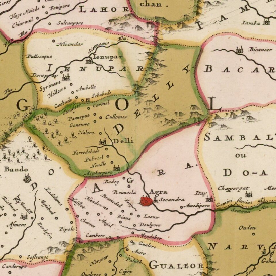 Extends south to include a large portion of India, including Narsinga, Orixa Decan, etc. Elephants shown roaming the Ganges and camels east of Kabul. Decorative cartouches and sailing ships. The map was originally issued by De Wit, circa 1690.