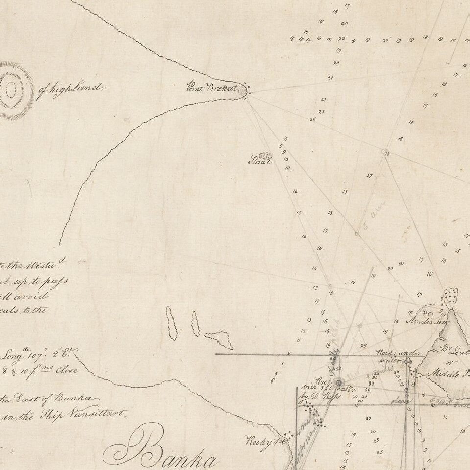 The chart is based upon Alexander's Dalyrmple's Chart of the Passage to the East of Banka Laid down from Observations in Ship Van Sittart'. By Captain Lestock Wilson, 1789. Published by A Dalrymple, 17 March 1792. Dalrymple's chart, published on 2 sheets, appeared in his East India Pilot. Following the demise of Captain Lestock Wilson's ship, William Bligh of Mutiny on the Bounty fame wrote the following entry in Voyage to the South Sea, on October 9, 1789, regarding the discovery of the survivors of the Vansittart: