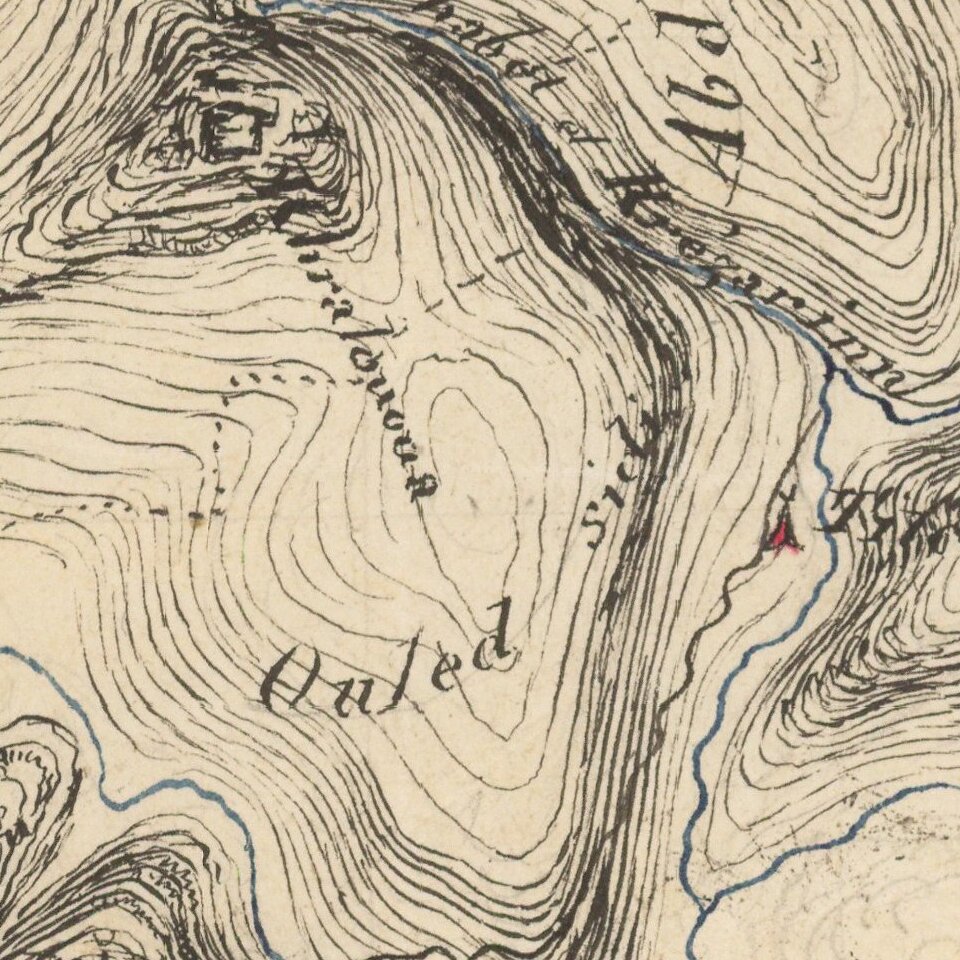 A manuscript map showing the hilly terrain between Blida and Medea in northern Algeria. It seems to be related to another map in the collection. Blida was a major site of tribal resistance to French conquest. It was prized as an agricultural center in the fertile Mitidja Plain. Shortly after capturing Algiers in July 1830, the French army advanced to nearby Blida but was ambushed and driven back to Algiers by the Beni Saha and Beni Misra tribes. In November 1830, General Clauzel led a second failed attempt to capture Blida as part of a mission to defeat the Ottoman bey stationed at nearby Medea. From 1836-1838, the French built military garrisons in six villages surrounding Blida, and eventually captured the city with significant effort in 1839.