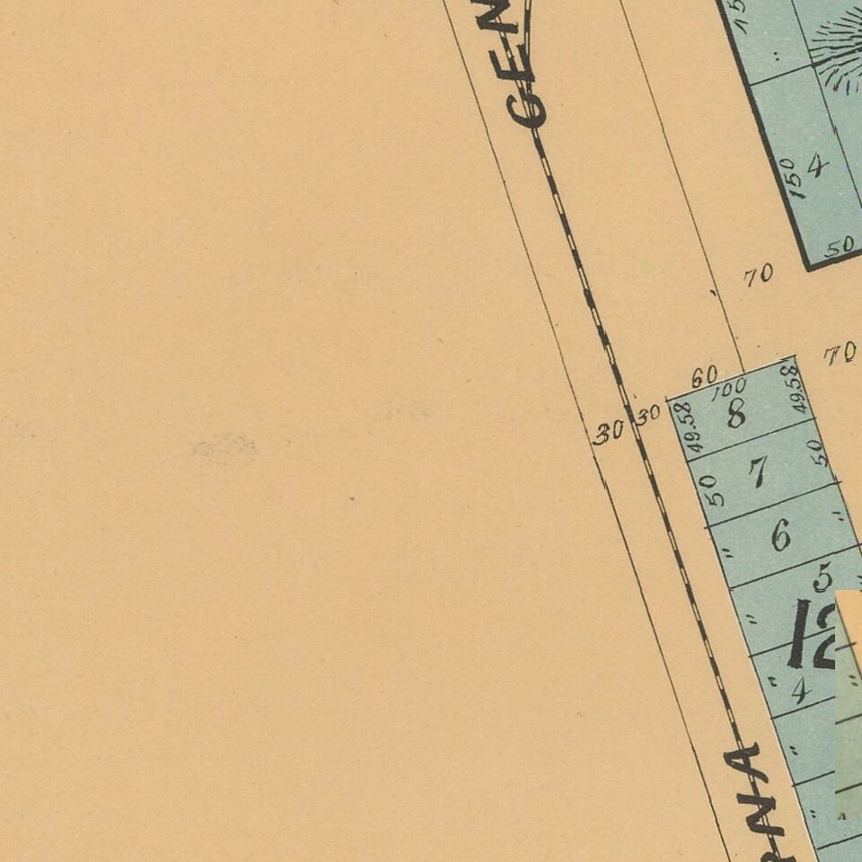 The lands covered are those which originally were acquired by Don Juan Forster in 1844, including the Mission and the present location of the Railroad Station in San Juan. Several of the streets named in the subdivision remain the same, although the subdivision plan does not match the current street configuration. The map is extremely rare, with the only recorded example in the Honeyman Collection.