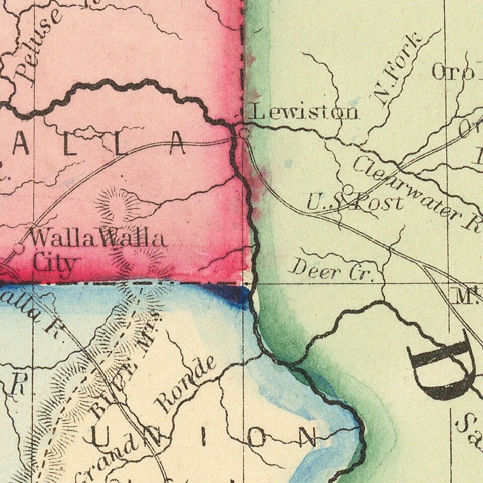 The map is copyright-dated 1860, and has counties in eastern Oregon but not in Idaho or Montana. The existence of Montana dates the publication to 1864 or later.