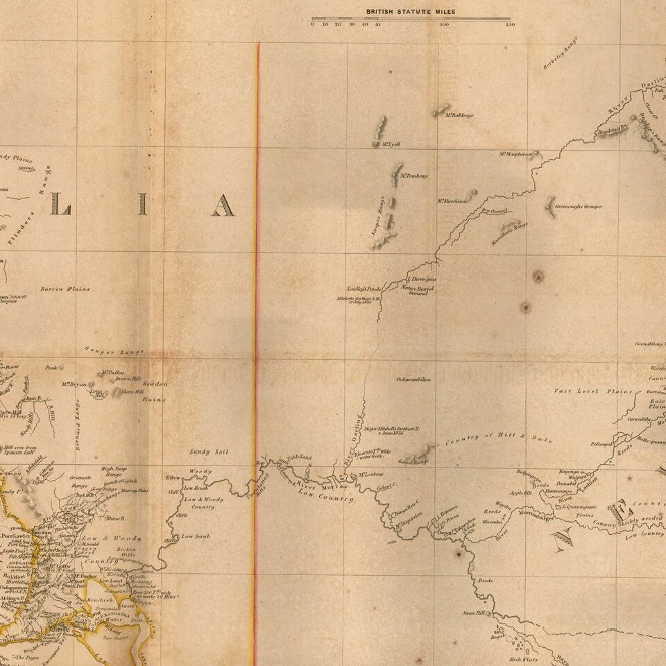 By the 1740s, the coastlines of the subcontinent were well defined following the explorations of Matthew Flinders and others. However, a majority of the interior remained a complete enigma. Importantly the map depicts the recent discoveries of several explorers, especially with respect to the conspicuous detail in the interior of what in now Victoria and the far southern part of New South Wales.