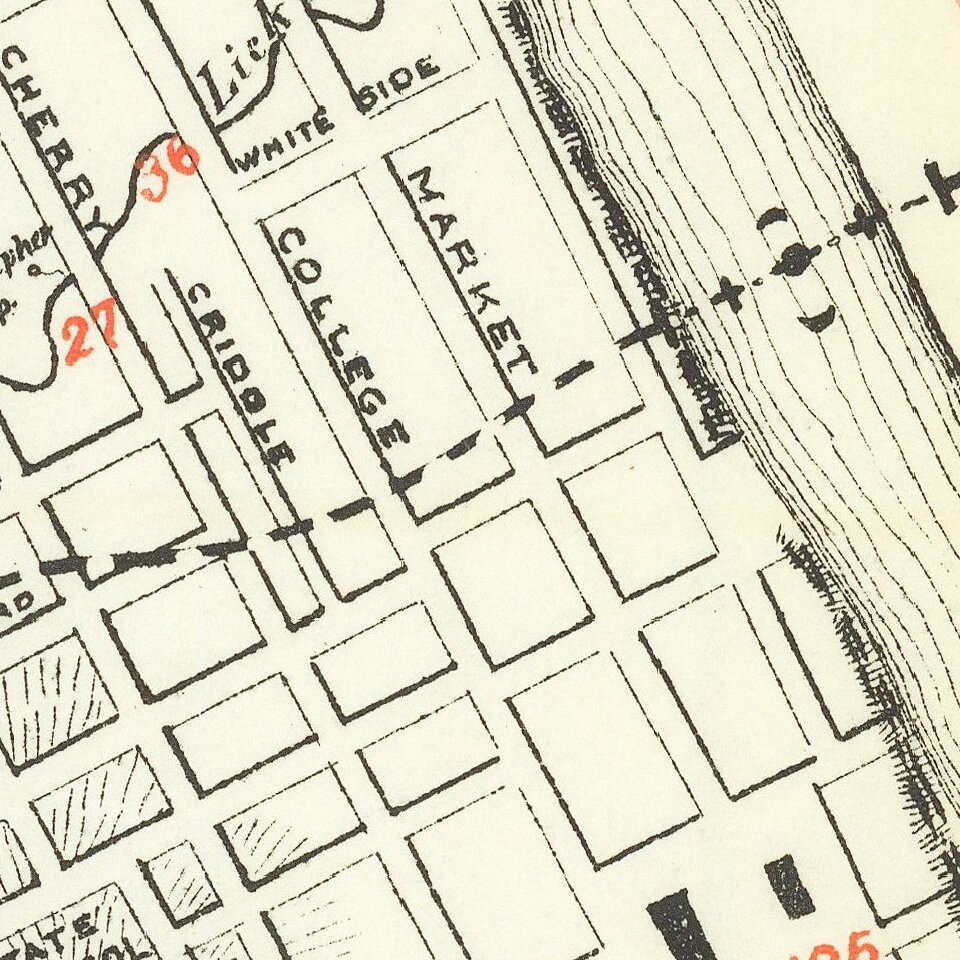 Scarce early map of Nashville, with redlines illustrating the High Water Mark of the Cumberland River -- 57 feet above the low water mark.