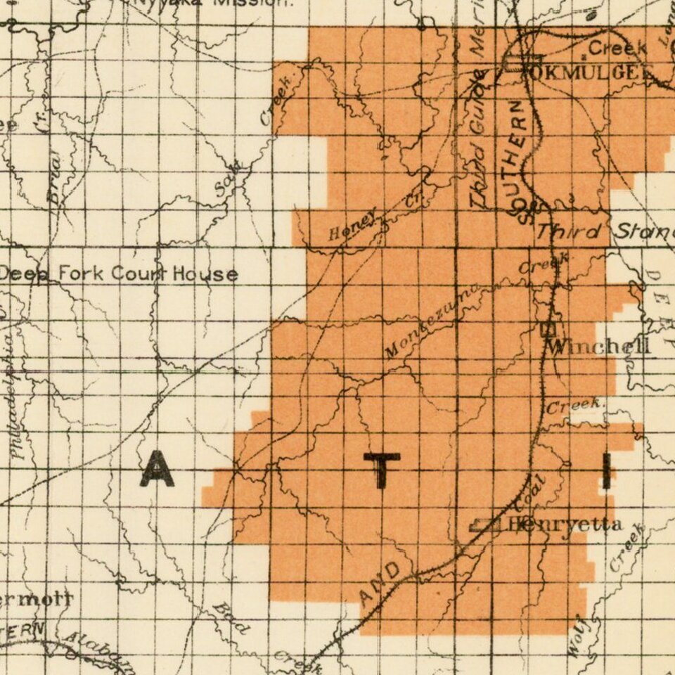 Striking map of the Creek & Seminole Nation lands in Indian Territory, showing the coal regions for the Department of the Interior.