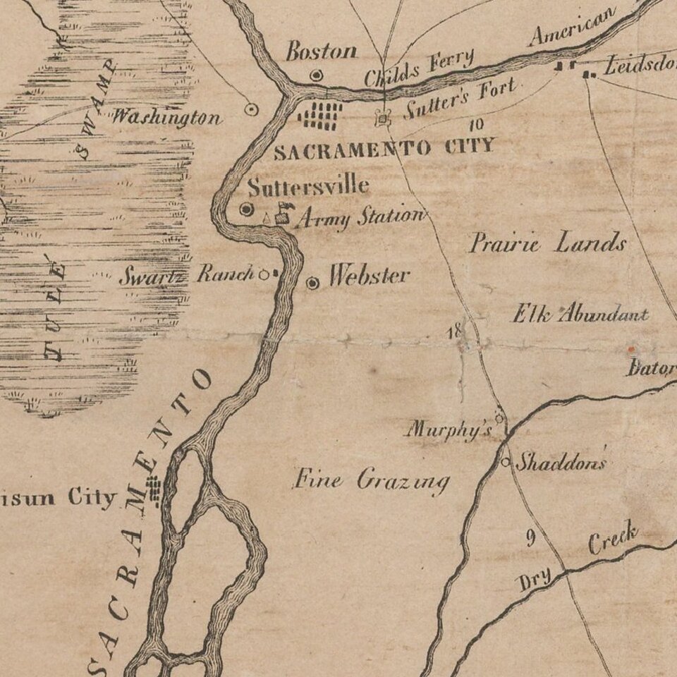 The Ellis map identifies Empire City on the Tuolumne River. The Jackson map names Crescent City in the same place, whereas the second edition of Jackson's map correctly refers to the map as Empire City. See below for the histories of these two towns.