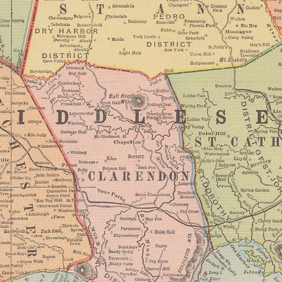 Attractive and highly detailed map of Jamaica, issued in Cram's scarce American Railway Atlas.