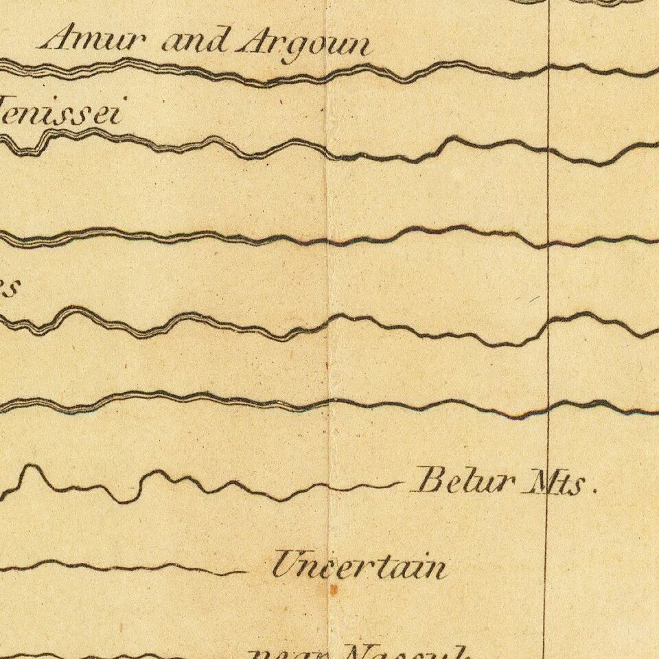 Interesting double-page engraved map of the rivers of the world, representing their comparative lengths (or the lengths as they were then known).