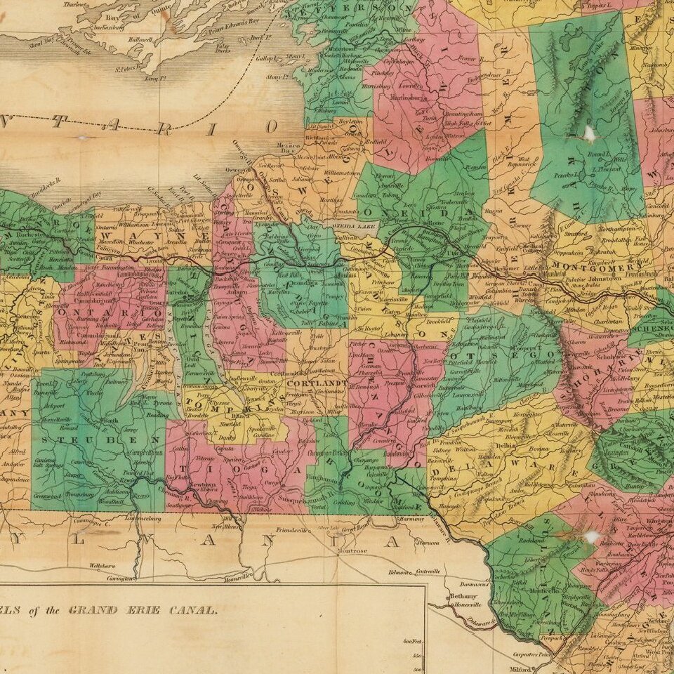 The map is hand colored by counties and shows towns, rivers, roads, lakes, mountains, islands, canals, etc. Excellent detail. Includes a profile of the Erie Canal and a statistical table showing information about the counties and county towns, including population, size and distance from Albany.