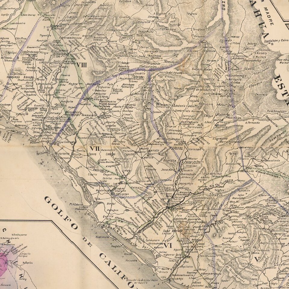 Rare map of Sinaloa in northwestern Mexico, lithographed by W.T. Galloway and published in San Francisco in 1882.