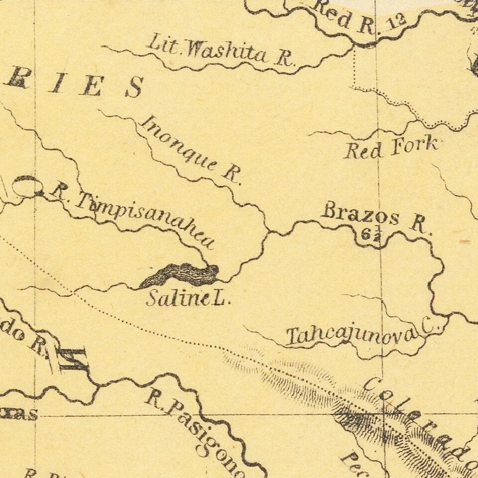 An interesting map of Texas published the year after the state's admission to the Union. In the North, several Indian Districts are shown, including the Comanches, Kiowas and Pawnee-Picts. A region named Wild Horses is shown, this nomenclature derives from the Austin map of 1830. Many roads in the southeastern portion can be seen and some early counties are shown. The region north of Texas is Indian Territory, in its very early hatchet shaped formation.