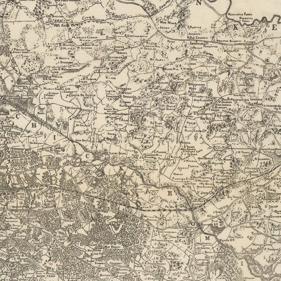 Rare map of the area between the Pamunkey and Ames Rivers, showing the Vicinity of Richmond, Virginia, as surveyed by Jeremy Francis Gilmer, surveyor for the Confederate States of America.