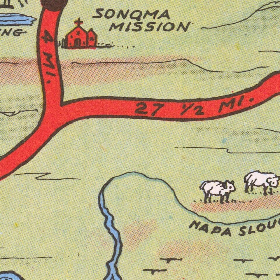 Striking map of the route from San Francisco to the Beringer Winery, with a decorative vignette of the front of the Winery.