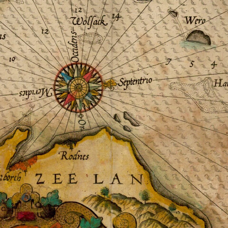The chart is richly embellished with compass roses, sea monsters, sailing ships and rhumb lines. The map appeared in Waghenaer's Speigel der Zeevaerdt.