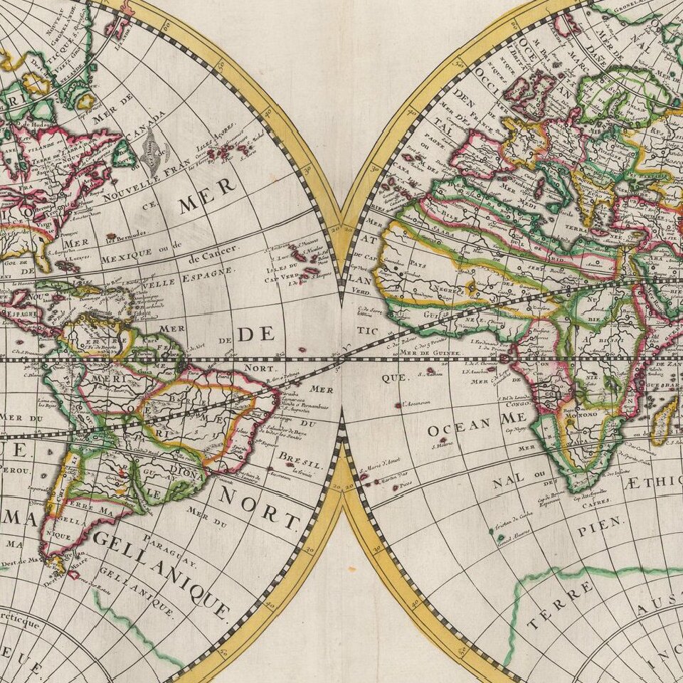 Sanson's double hemisphere map of the world is noteworthy for a number of reasons. It is Sanson's first depiction of the island of California, using a model for the shape of California which would come to be known as the 1st Sanson model. The map also provides a good look at the Great Lakes of North America, a region for which Sanson's regional maps would become the most advanced depictions of the cartography of the region for the next 30 years. The map depicts a curious NW Coast of America, separated from California by an unnamed strait, certainly a curious omission for someone as meticulous as Sanson. This NW Coast would disappear from his subsequent maps.
