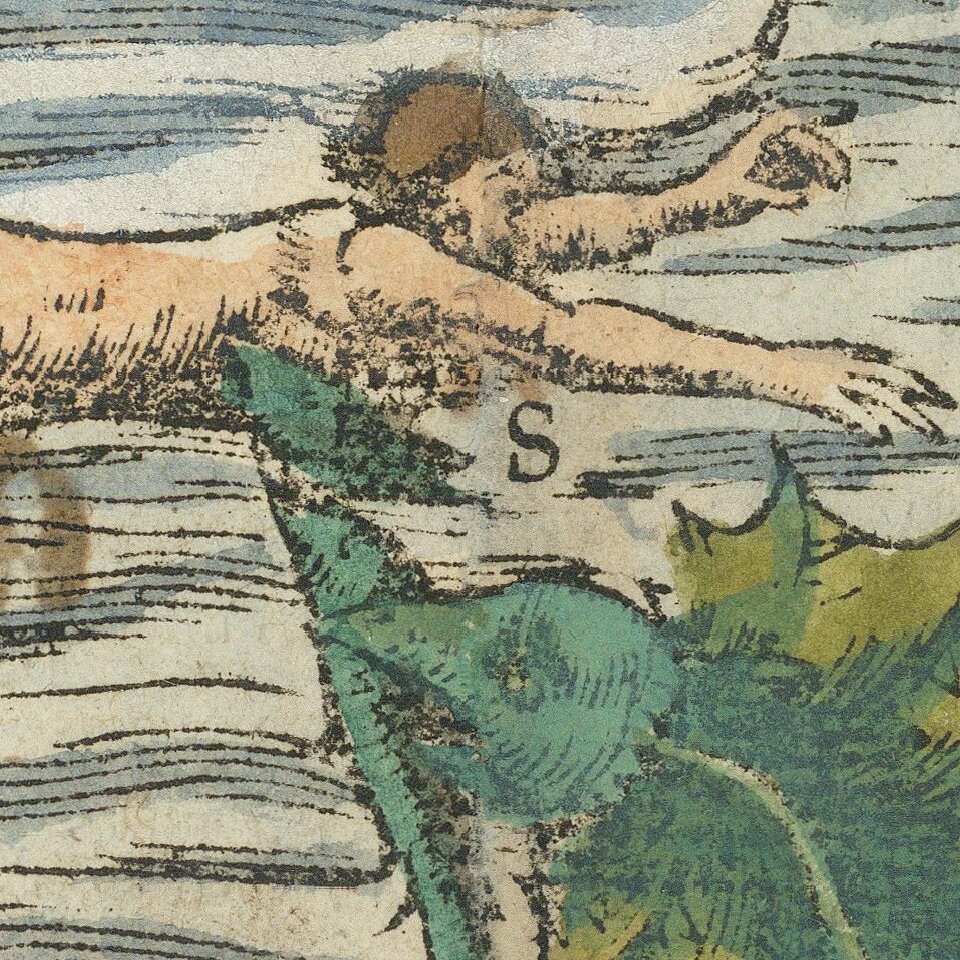 During the Renaissance, which coincided with the shift to print technology, Münster, the maker of this chart, was a pioneer in shifting the style of sea monsters. Previously, monsters were drawn in flat profile with little movement indicated. During the sixteenth century, monsters began to be shown as three dimensional, thanks to shading, with implied movement and dynamism. Cartographers also harkened back to Classical sources for zoological imagery, rather than Medieval antecedents. Münster’s world map, engraved by Hans Holbein the Younger, in Simon Gyrnaeus and Johann Huttich’s travel collection, Novus orbis regionum ac insularum veteribus incognitarum, shows this emerging Renaissance style.