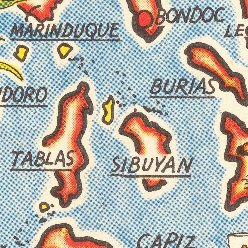 Lively pictorial map of the Philippines, drawn by John G. Drury of the 2145th Ordnance Battalion.