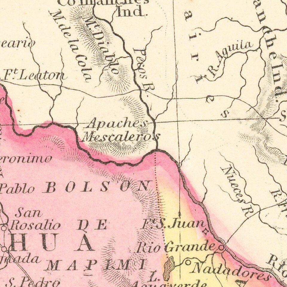 Many of the early place names in Texas still appear. Pre-Gadsden Purchase border with Mexico.
