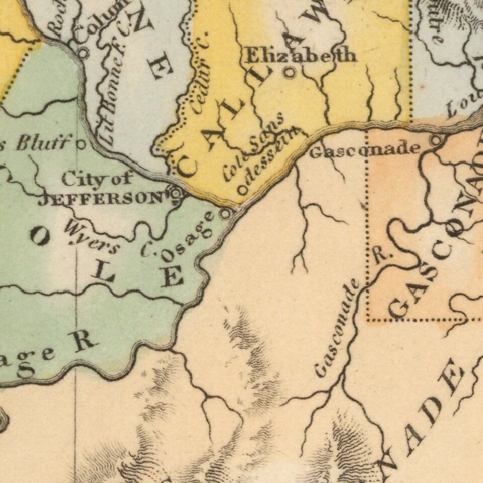 Early state boundaries and most Western area are not yet partitioned into smaller counties. An Osage Boundary Line passes through the Western counties. The state, bordered by Missouri Territory to the North and West, is hand colored by counties, showing towns, rivers, forts and other details. Unusual open lands listed as attached to Gascongade (County). Many of the old French and Fur Trading towns and settlements on the Mississippi are still in evidence.