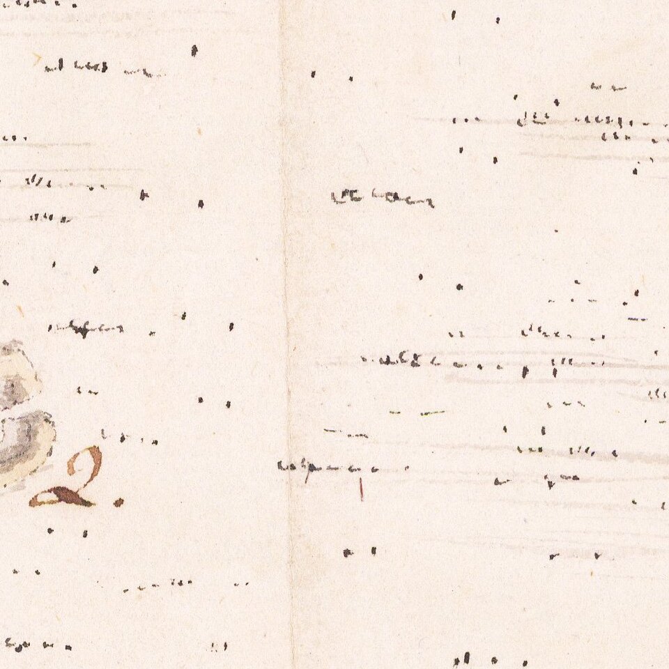 Pour empecher les Contrebandes on a etables le Corps le Corps de guarde le pour surveiller en meme tems qui on ne vienne percer les digues; avec la grand guarde ??? 1. 2. & 3 restles d'anciens ouvrages du tems des Espagnoles --- ?? 5. 6.7 & 0 Ligne de demarcation des posssessions munstriennes sur notre territoire.