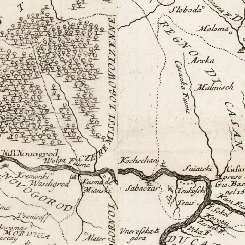 Coronelli's map of Russia is one of the most detailed and elaborate maps of the 17th Century, providing tremendous detail in the fine exacting style which characterizes Coronelli's maps. The map is further embellished by two elaborate decorative cartouches and many vignettes of indigenous peoples, villages, hunting, animals, etc, including depictions of the nomadic tribes extending north from the Caspian Sea to east of the Gulf of Nova Zembla. The Cosack warriors are seen in the southeast part of the map.