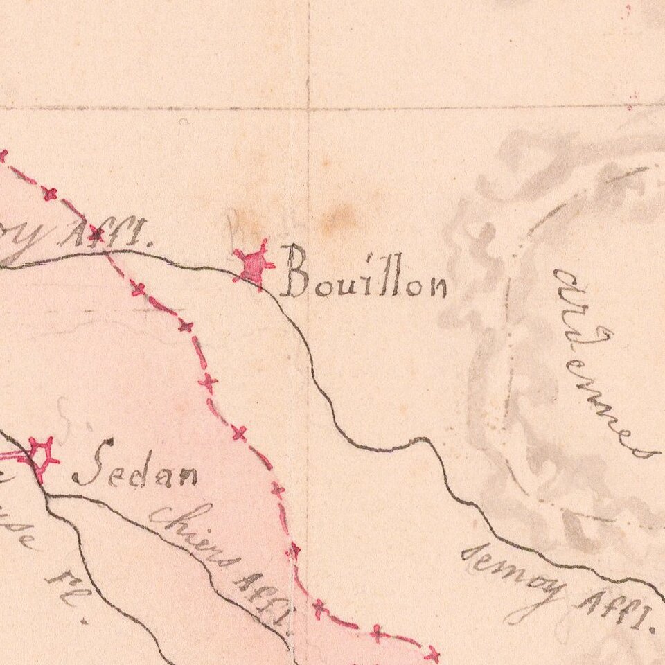 Finely executed manuscript map of the Theater of War in Northwestern Europe, illustrating various battles, some with dates.