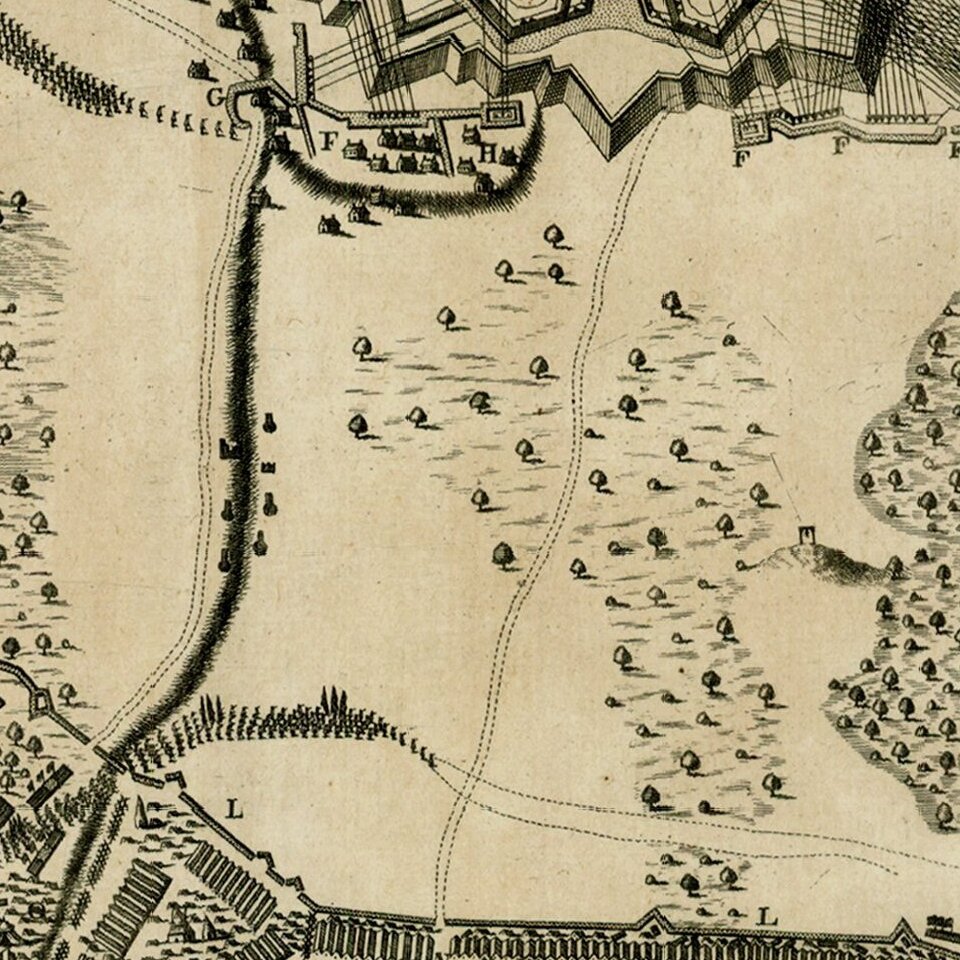 The map shows the fortifications, troop placements, batteries and movements of the Siege of Narva, in November 1700, which took place during the Great Northern War. The various troop positions are shown, including the names of commanding officers. The plan is one of the most detailed surviving battle accounts and is apparently very rare, as we could find only a single reference to the map's existence in a biographical sketch about the life of Zacharias Wolf.