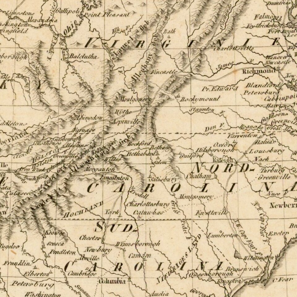 The map appeared in a very rare German travel book, entitled Reise in das innere Nordamerikanischen Freistaaten, westwärts der Alleghany=Gebirge. Aus dem Französischen. Mit einigen Zusätzen und Anmerkungen herausgegeben von T.F. Ehrmann. Mit einer Charte.