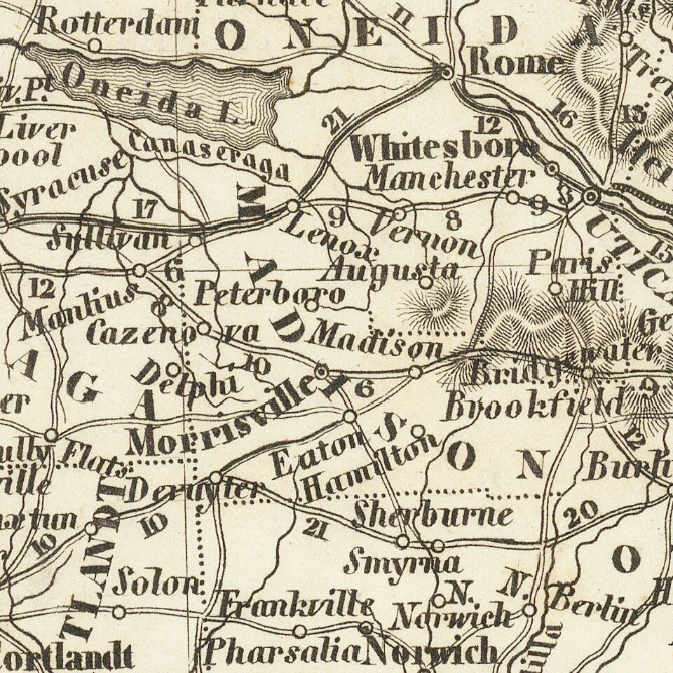 The map shows the routes, railroads, and distances in the state, though it also locates various other features including rivers, canals, and more. The names and outlines of the counties at the time are shown. The adjoining states of Pennsylvania, Vermont, and Connecticut, as well as part of Canada, are all shown.