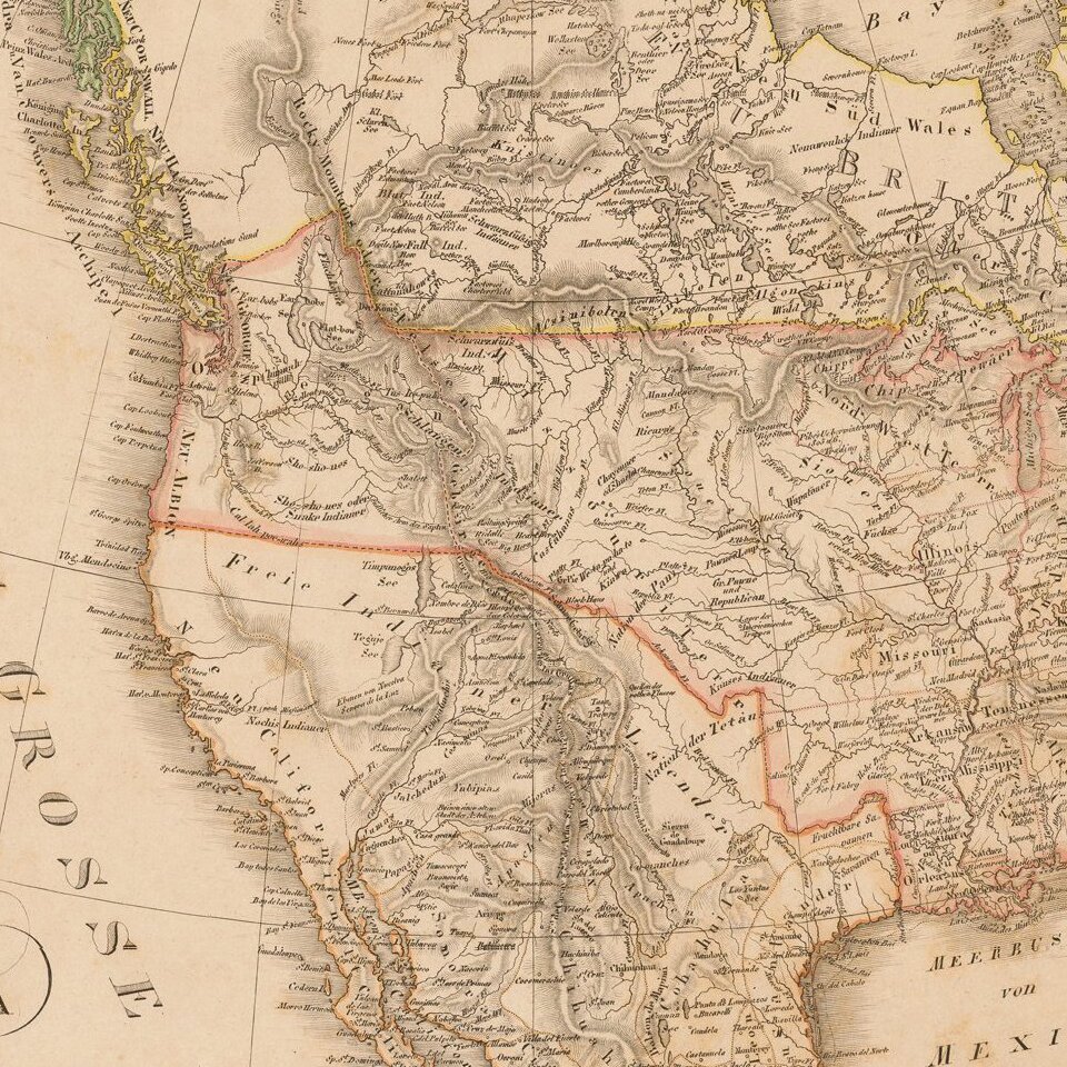 The map includes fine detail in Neu (Upper) California, including the Missions, mythical rivers, but pre-dates the 1834 appearance of Russian Settlements near San Francisco on the map. Highly details NW Coast of America, including American, British and Russian settlements and forts, Indian Tribes, etc. Nice detail in Alaska, which is called "Nordlicher Polar Kreis." Massive Northwest and Missouri Territories shown.