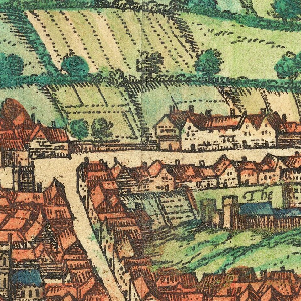 This fine view of Norwich is based on William Cuningham's plan of 1558. Viewed from the northwest its situation on a bend in the River Wensum is shown surrounded by verdant farms and pastures. The Norman Cathedral of the Holy and Undivided Trinity is at the heart of the city and to the right, on top of a small hill, is the castle.