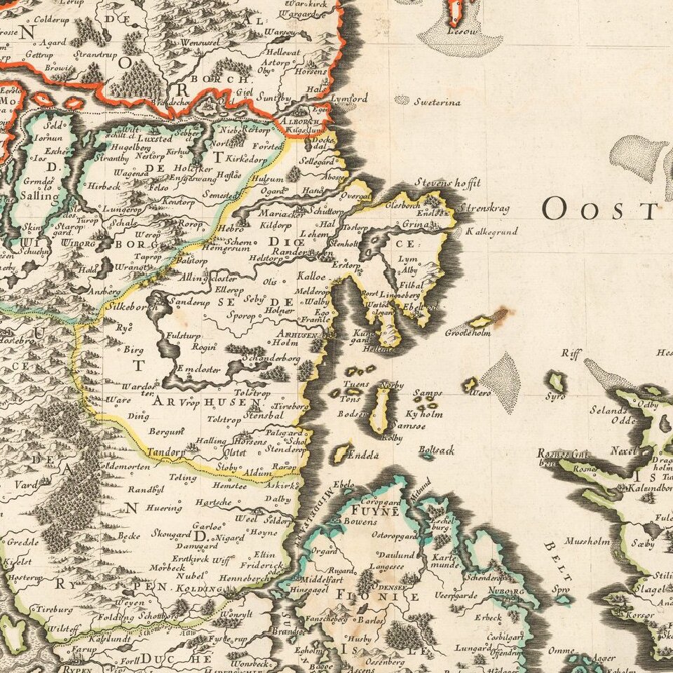 Sanson's 1659 double-page engraved map of Denmark. The map includes a very elaborate cartouche in the lower left corner and is in old outline hand color.