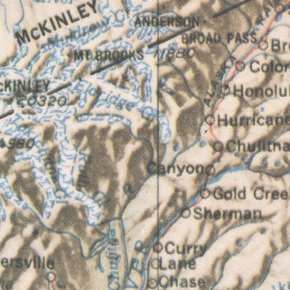 Detailed map poster depicting the topography of Alaska set amongst stippled drawings showing pictures of Alaska’s snowy landscape and life. This is the first time we have seen the poster.