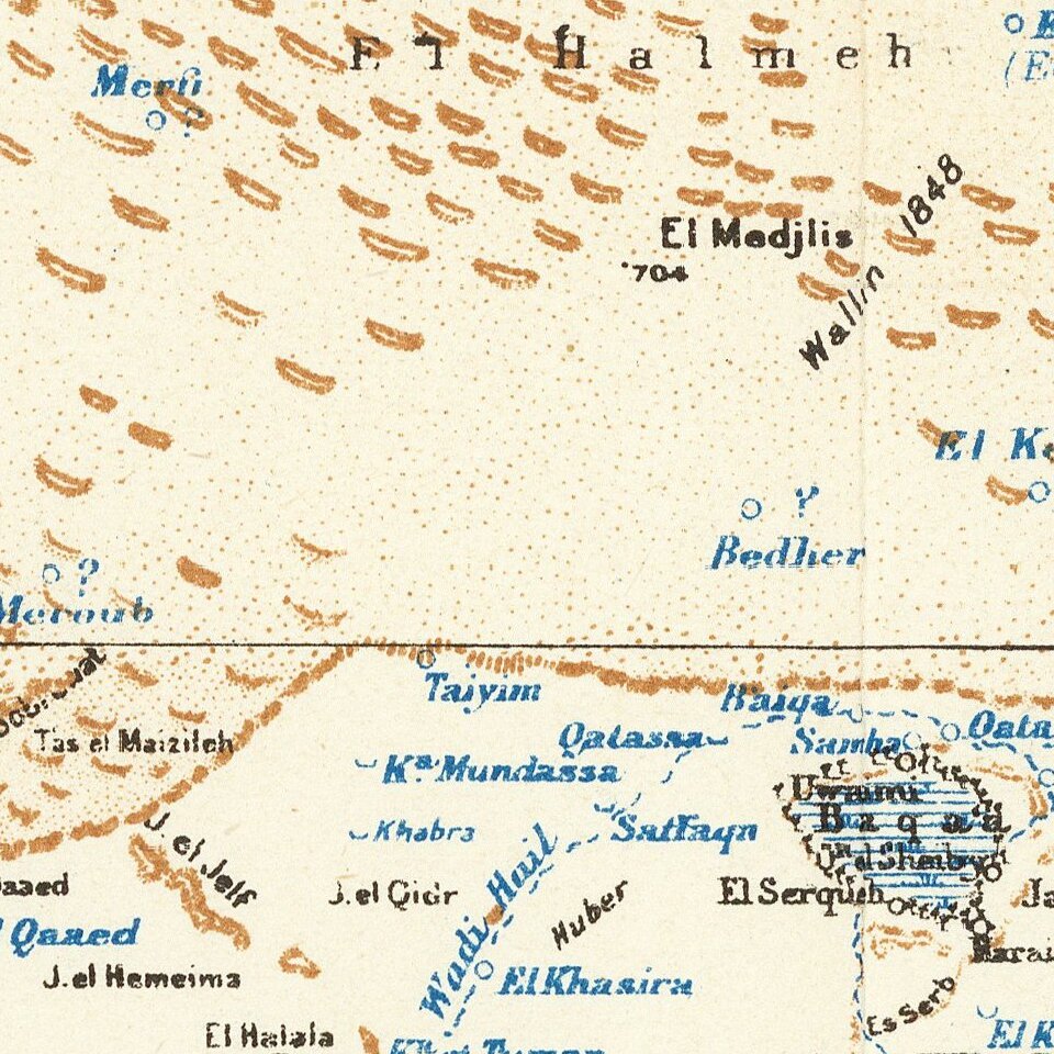 The map illustrates the physical features of northern Arabia, i.e., the steppe from Arabian Hasa (often seen as Ahsa) in the southeast to Jerusalem in the northwest. The map detail includes altitude contour lines, lakes, rivers, and seasonal stream courses (wadis).