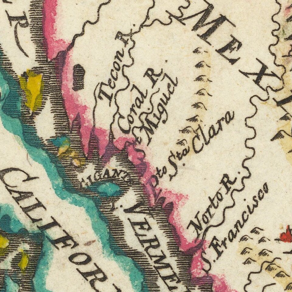 First published in Paris in 1683, Mallet’s map is notable because it follows neither the better known Sanson or Briggs models of California as an island. The island is long and thin, with a craggy western coast. Several place names are included near the coast, including Pto. S. Francisco Draco, a reference to Drake’s visit to California during his circumnavigation of 1577-1580.