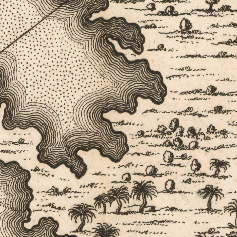 The map states that it is based upon an English original of 1741 and has both French and German text. The map describes the events of March 1741 when the city was attacked by the troops of the English admiral Edward Vernon. He had arrived at Cartagena with a large fleet of ships and men. After weeks of intense fighting, the siege was repelled by the Spanish commander, General Blas De Lezo and his forces, who inflicted heavy casualties on the English troops.