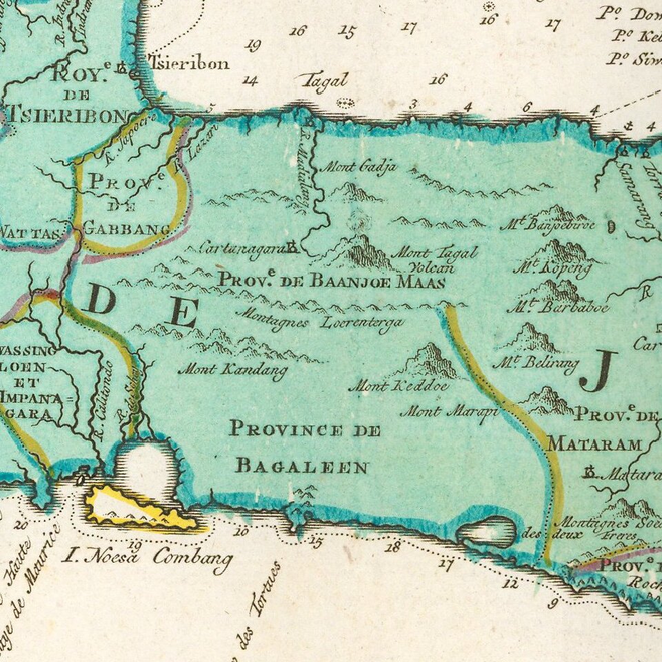Detailed map of Java and Madura, with outline color showing the provinces on Java and a host of other details.