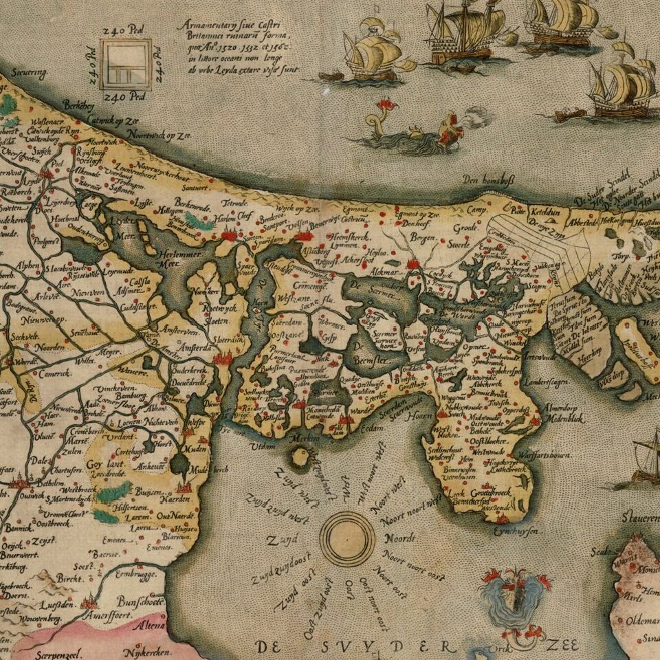 Gerard De Jode (1509-1591) was a pre-eminent mapmaker in the late seventeenth century, a time when the Dutch dominated the map trade. He was known for his many maps, some of which featured in Speculum Orbis Terrae (first edition Antwerp: 1578). Although never as successful as Ortelius’ Theatrum, the Speculum did get republished in a second edition in 1593, two years after De Jode’s death, by Arnold Coninx, and included this map. After his death, Gerard’s son, Cornelis (1568-1600), and his wife, Paschina, ran the shop. Unfortunately, Cornelis died young in 1600, aged only 32, and the stock and plates were sold to the publisher Joan Baptista Vrients.