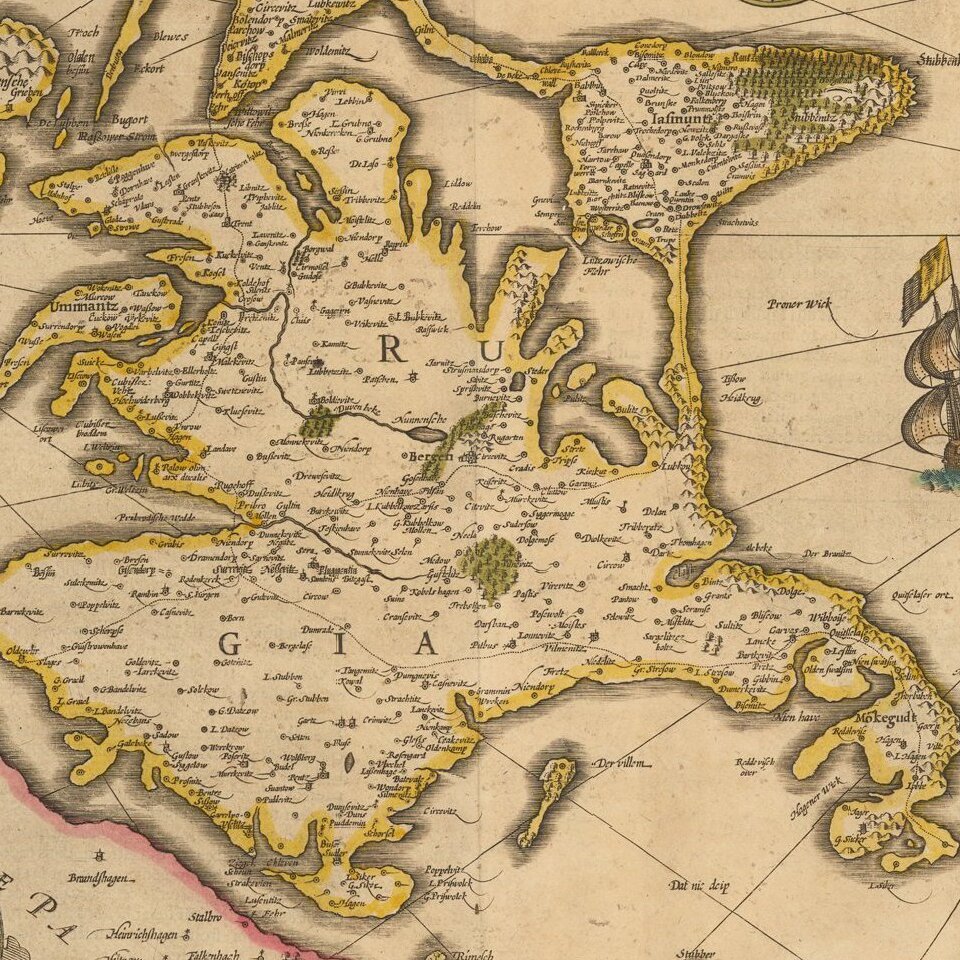 Jan Janssonius (also known as Johann or Jan Jansson or Janszoon) (1588-1664) was a renowned geographer and publisher of the seventeenth century, when the Dutch dominated map publishing in Europe. Born in Arnhem, Jan was first exposed to the trade via his father, who was also a bookseller and publisher. In 1612, Jan married the daughter of Jodocus Hondius, who was also a prominent mapmaker and seller. Jonssonius’ first maps date from 1616.