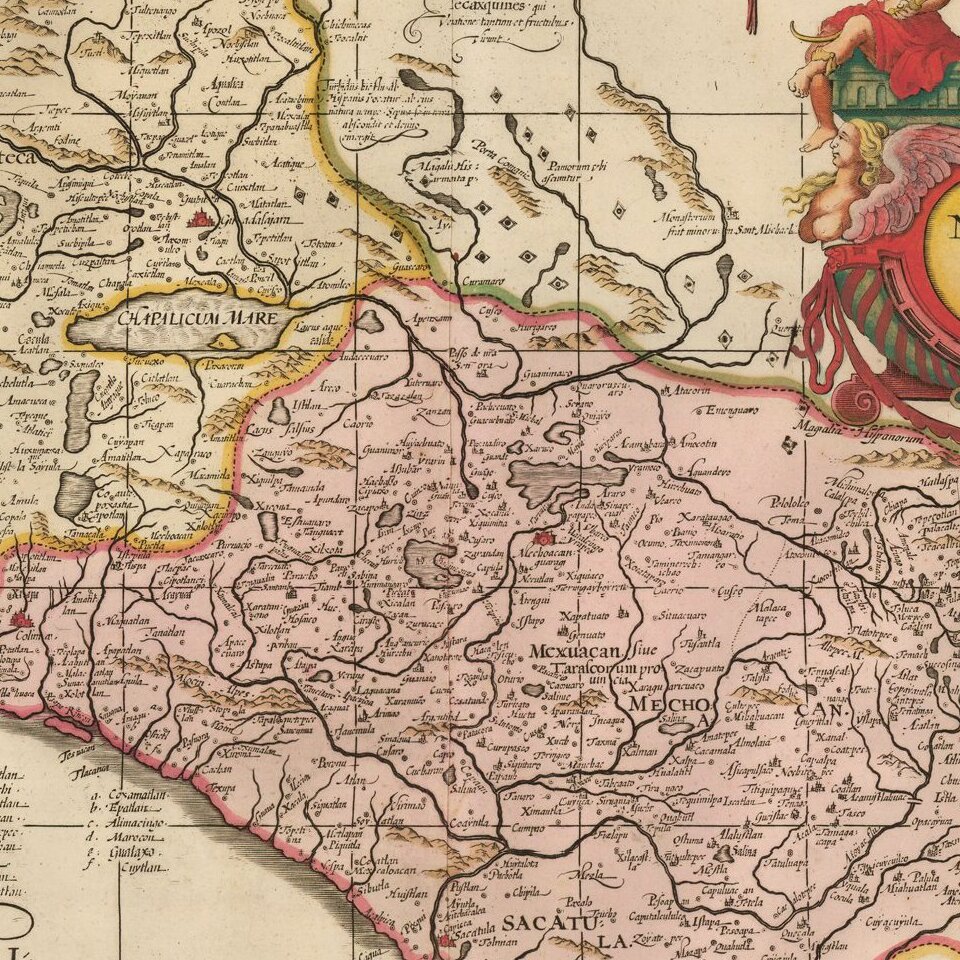 Gorgeous map of Mexico extending from just north of Mazatlan to Acapulco and from Tehuacan to the Sierra Madres, showing Mexico City, Puebla (Angelorum Civitas), Colima, Campostella, Purificatio and Mechoacan as the major cities of the time.