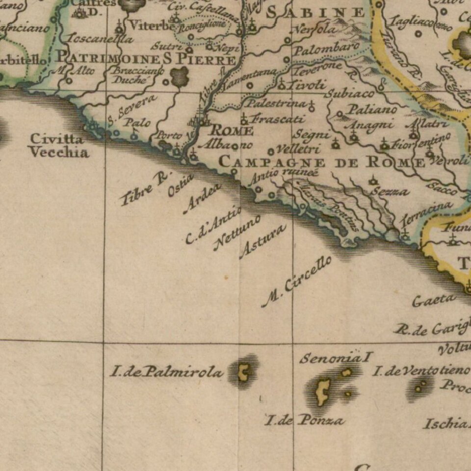 The business specialized in publishing French geographers including Deslisle, Jaillot, and Sanson. They also published atlases, for example a 1725 reissue of Frederik de Wit’s Atlas Major and an atlas, with additions, from the works of Guillaume Delisle. There were also Covens & Mortier pocket atlases and town atlases. The company profited from acquiring plates from other geographers as well. For example, the purchased Pieter van der Aa’s plates in 1730. Finally, they also compiled a few maps in house. At their height, they had the largest collection of geographic prints ever assembled in Amsterdam.